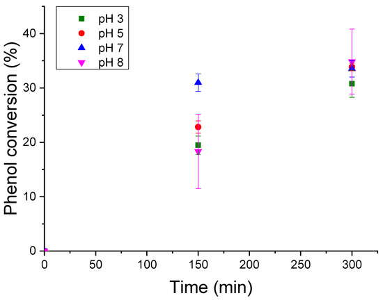 As reported in Figure 10, at a reaction time of 150 min, the phenol conversion was higher at neutral pH (~7); there WAs only a slight difference in the phenol conversion at the end of the tests for pH 5, 7, and 8. The results show that the phenol conversion at 150 min was the lowest for both pH = 3 and 8. However, from an industrial point of view, the disadvantage of operating at a different pH from the natural value is the necessity of neutralizing the solution before disposal. Thus, the best choice for a possible industrial implementation of heterogeneous photocatalysis in the treatment of wastewater containing phenol would be to leave the solution pH unchanged.