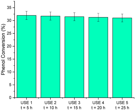 The reusability of the catalyst was checked by conducting dedicated kinetic experiments, adopting the experimental conditions set for test 8 in Table 2, for a total of five cycles, i.e., 25 h or reaction time. The results of the phenol conversion after each reuse experiment are reported in Figure 11.