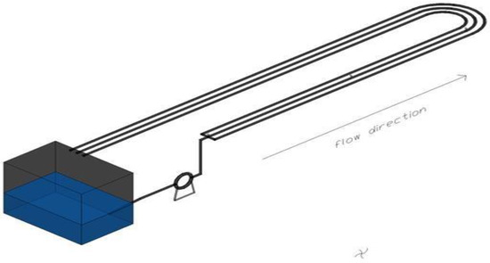 The experiment included a flow loop test and the creation of a modified XG mixture for aqueous drag reduction. To reduce drag, RXG solutions of a certain concentration were made. The desired concentration of the modified XG mixture was added to water and stirred at a high speed of 1200 rpm for 30 s to produce stock solutions of the modified XG mixture with concentrations of 300, 600, and 950 ppm. After that, additional water was added, and the mixture was agitated for 5 h at a slower speed of 100 rpm, after which it was left for 24 h for the complete equalization of the stock solution and the creation of aqueous xanthan. To begin the flow loop test, the water pump was turned on. As shown in Figure 2, the modified XG mixture passed through the flow meter and pump before entering the test section of the pipeline through the intake. Thereafter, the test pipeline’s observation and test portions began receiving water. The experimental parameters were recorded, and photographs were taken after the flow stabilized and the pressure gradient fluctuated by 5%. When passing through pumps in experimental applications, polymers degrade under shear. Mechanical deterioration causes the molecular weights to decrease and the drag reduction efficiency to decrease [19]. This issue may be avoided by using a one-pass method, which ensures that the polymers behind the injection point are always new and undamaged and the XGs are continually injected into the flow. Experimental research can use a one-pass system, but it might not be practical.