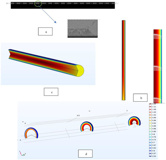 Based on the shapes of the individual pieces, meshes can be categorized into three primary categories: structured, unstructured, and hybrid. Mesh is a crucial component in mathematical computation. It is common knowledge that a finer mesh will produce more precise results, lowering rounding errors to produce a smaller step size. It will increase the accuracy and effectiveness of the interpolation. The pipeline’s actual dimensions, as illustrated in Figure 3a, were used to develop the geometry. The setting of the mesh cell is illustrated in Table 2. The maximum cell size of 0.00142 m, the lowest cell size of 2.03 × 10−5 m, and the curvature factor of 0.25 were obtained in medium smoothing, and the average skewness of the surface mesh should be as optimal as possible. The total number of elements is presented in Figure 3b for the pipeline mesh.