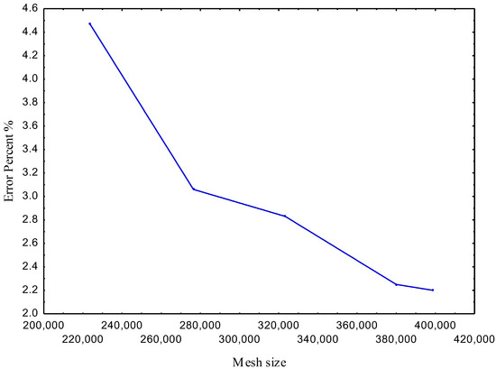 To test the mesh sensitivity, various grid systems were used. The test analysis depended on the percentage error between the experimental and theoretical values of the pressure drop. The mesh number ranged between 230,000 and 400,000. The analysis demonstrated that the results of the pressure drop errors were unaffected by mesh counts greater than 350,000, as shown in Figure 4. Hence, a mesh size of 398,733 was used to obtain more accurate findings.