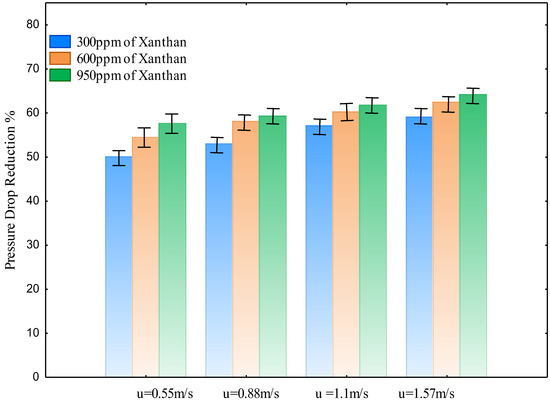 The increase in the pressure drop reduction varied with concentration: 950 ppm resulted in a higher value in the pressure drop reduction at all values of velocity (58–65)%, which could be due to the strong emulation that this concentration can cause. However, 300 ppm of XGs resulted in a lower value of reduction (50–59)% at all velocity ranges, while the use of 600 ppm resulted in a reduction of (54–62)%. Based on the experimental results, the polymer with a concentration of 950 ppm was selected. This result is similar to other workers who showed that an increase in the polymer concentration causes an increase in the reducing pressure drop [25,26]. However, this result differs from that obtained by [27], who showed a decrease in reduction with an increase in the polymer addition, which may be due to the type of polymer used.