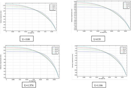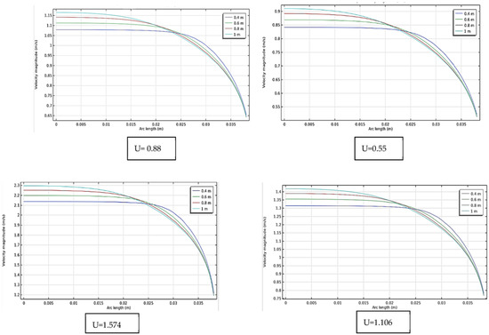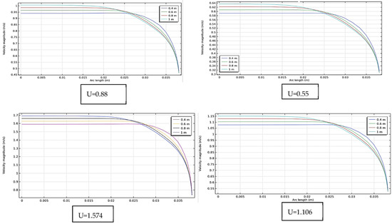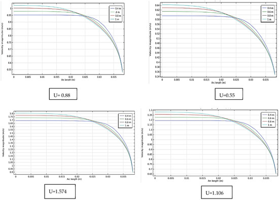 The COMSOL Multiphysics simulation created the velocity distribution variation throughout the pipe for all modified XG mixture concentrations, and the results are depicted in Figure 7, Figure 8, Figure 9 and Figure 10. Figure 7a–d shows the velocity behavior of flow at different positions inside the pipeline, namely (0.4, 0.6, 0.8, 1 m) and four different flow speeds, namely (0.55, 0.88, 1.106, 1.574 m/s) without additives. There were distinct changes in the velocity magnitudes at each flow speed, where the velocity magnitudes increased as the flow speed increased, versus differences in the length’s positions.