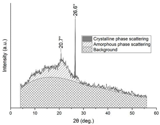 X-ray analysis shows that the wheat straw powder has an amorphous-crystalline character (Figure 2). Two crystalline peaks at Bragg angles of 20.7° and 26.6° with parameters of 4.281 Å and 2.251 Å, respectively, are observed on the X-ray diffraction pattern (Figure 2).