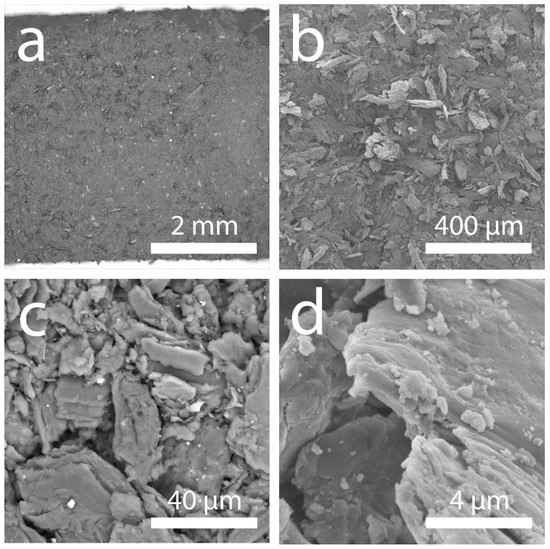 Figure 4 shows SEM images of wheat straw powder particles at different resolutions. The analysis of microphotographs of wheat straw powder particles (Figure 4) shows that the particles do not have a pronounced shape; the plates have irregular shapes and different sizes, including the ones in the form of flakes. The particle size varies from 2 to 25 µm. The microphotograph shows that individual particles are combined into large agglomerates up to 150 μm in size (Figure 4b).