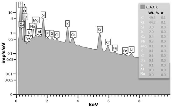 The spectrum of energy dispersive microanalysis of the plant-based filler—wheat straw—is shown in Figure 5. The analysis of the obtained data reveals that wheat straw mainly consists of atoms C (49.5%) and O (44.2%). In addition, the spectrum of wheat straw shows the following atoms: Si, K, Ca, Ni, Mg, S, Cl, Fe, and P. H atoms are absent in the spectrum, since H is outside the range that is registered by EX-2300BU.