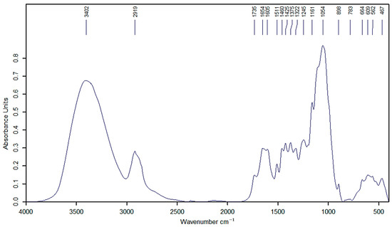 Figure 7 shows the FT-IR spectrum of wheat straw powder. In the FT-IR spectrum there are absorption bands with the following maxima: 466.89; 561.73; 609.10; 663.67; 782.59; 897.68; 1054.08; 1161.27; 1244.66; 1322.47; 1375.21; 1424.98; 1460.46; 1510.65; 1604.96; 1654.07; and 1734.51 cm−1 and broad absorption bands in the regions of 3000–2900 cm−1 and 3650–200 cm−1.