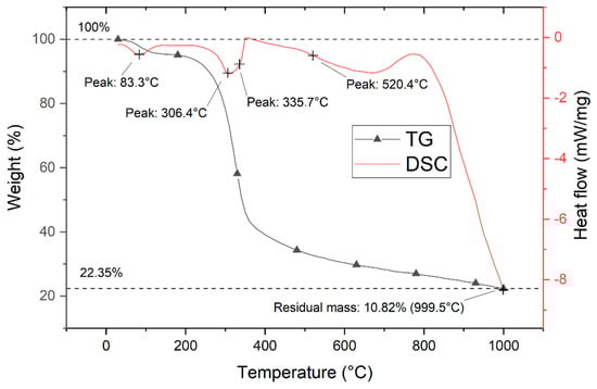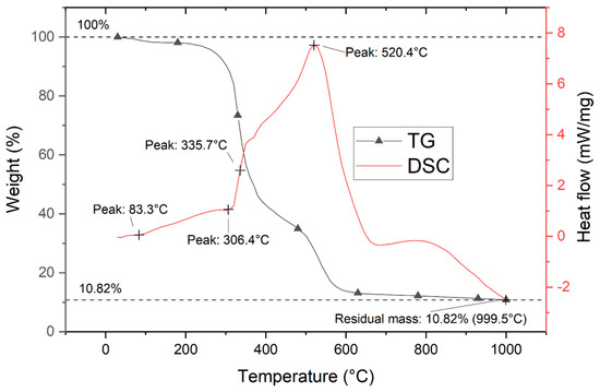 Figure 9 shows TG and DTA curves of the composite containing 30 wt.% wheat straw powder. The DTA curve of the composite is characterized by endo-effects with highlighted maximums at temperatures 83.3 °C, 306.4 °C, and 335.7 °C, which correspond to the thermal effects occurring with the wheat straw filler. The values of these three peaks coincide with the data of the thermal analysis of the wheat straw powder itself (Figure 8). The first peak (83.3 °C) corresponds to the process of intensive removal of adsorbed water; the second peak (306.4 °C) corresponds to the beginning of intensive loss of wheat straw weight; and the third peak (335.7 °C) is associated with the maximum thermal decomposition of wheat straw powder. A vaguely pronounced peak at 291 °C corresponds to the exo-effect of oxidation of gaseous products of polymer decomposition and is superimposed on the endo-effect, which is the consequence of bonds breaking in the polymer. Another exothermic peak is observed at 520.4 °C. The exothermic peak is associated with the maximum thermal decomposition of the epoxy binder.