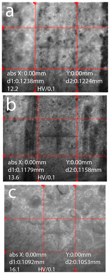 Image of the imprint of microhardness tester indentor when measuring microhardness at a load of 100 g on the surface of polymeric binder (a) and composites with wheat straw with the filler content: (b)—30 wt.%; (c)—50 wt.%.