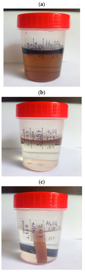 Figure 12 shows that with increasing acid concentration there is a significant change in the color of the solution after one month of the exposure of the composite. This may indicate the degradation of the composites due to the acid oxidation reactions in the samples. At the lowest acid concentration of 1:11 the solution practically did not change and remained transparent (Figure 12c). At the acid concentration of 1:3 a slight darkening of the solution was observed (Figure 12b). At the highest acid concentration of 1:1, however, the solution darkened completely (Figure 12a).