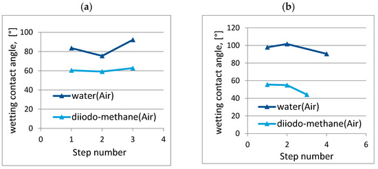 where: γS, γL—surface energy of solids and surface tension of liquids; are polar and dispersive components of the surface energy of a solid and the surface tension of a liquid, respectively.