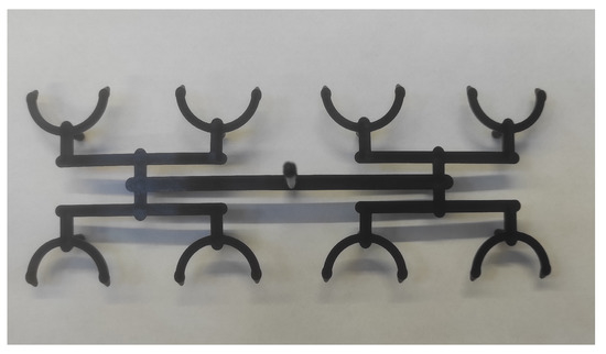 The waste of cold runner systems remaining after the industrial injection process was crushed with a low-speed granulator, and the regrind obtained during the process was used to make a new series of products (Figure 3). The samples were produced using an Engel Victory 50 injection molding machine. The injection molding temperature was 260 °C, mold temperature = 40 °C, injection pressure = 675 bar, holding pressure = 420 bar, and holding/cooling time = 6/15 s.