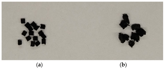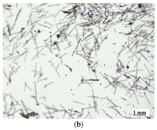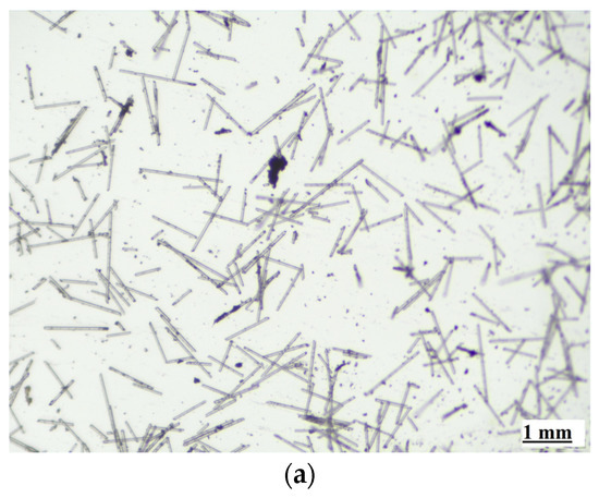 Short-glass-fiber-reinforced polyamide 6 materials are widely used in the automotive and construction industry where lightweight, creep resistance, stiffness, and durability are required [19]. During the mechanical recycling of fiber-reinforced polymers, the matrix material and fiber chains break, which can change the physical thermo-mechanical properties or appearance of the finished product [20]. The length of the fibers may be shortened during mechanical processing related to the grinding of residues. Therefore, the original granulate and regranulate were burned in a muffle furnace at 600 °C to separate the inorganic phase in the form of glass fibers. Figure 4 shows the structure of the glass fibers in the pure granulate and in the granulate from the milled runner waste. It should be emphasized that no significant shortening of the fibers in the regranulate was observed. This allows the waste to be classified as raw material and the use of material recycling in the production process. The average glass fiber length measured by optical microscopy was 1.6 mm for virgin PA6 and 1.4 mm for regranulate PA6, respectively.