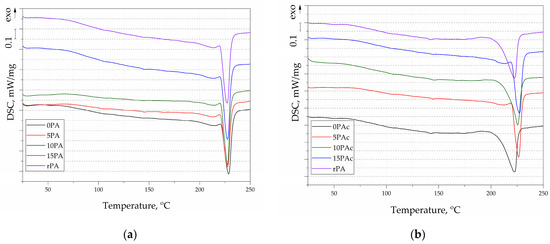 Differential scanning calorimetry (DSC) analysis was conducted using a Netzsch DSC 204F1 Phoenix (Selb, Germany). Polyamide samples weighing 10.0 ± 0.15 mg were placed in aluminum crucibles with pierced lids, heated, and cooled in the range of 25–250 °C at a rate of 10 °C/min under an inert nitrogen atmosphere with two heating/cooling cycles. The crystallinity level of the materials was calculated based on the following equation: