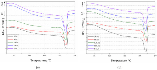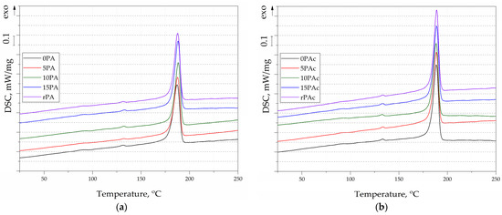 The determination of the degree of crystallinity of crystalline polymers after thermomechanical treatment is essential to understand its properties [23,24]. DSC analysis was performed for virgin material and samples containing regrind. The thermograms recorded during the first and second heating and the first cooling in the DSC test are shown in Figure 6, Figure 7 and Figure 8. The melting temperatures from the first and second heating (TmI and TmII) and temperature crystallization Tc from the first cooling cycle, as well as the melting enthalpy (ΔHmI and ΔHmII) and the degree of crystallinity (XcI and XcII), are summarized in Table 1. The main endothermic peak related to the melting of the polymer material as a result of the first heating cycle was observed at a temperature of approx. 227 °C. A slight decrease in the melting point can be observed for conditioned samples, especially for samples with a high content of regrind and regrind only (rPAc). A single peak at the melting point (TmII) of approximately 220 °C for all samples tested was observed in the second heating cycle. The melting temperature variations were very small, confirming that post-processing material can be recycled at constant process parameters like raw polyamide. Furthermore, the crystallization temperature in all cases was similar and averaged 188 °C. A slight increase in the degree of crystallinity can be observed for the conditioned materials both in the first and in the second heating cycle. The average XcI value for the unconditioned polyamide was 35% and, for the conditioned, 37%. However, the value of XcII for the PA series was, on average, 25% and for PAc series 26%. No significant influence of the regrind addition on the thermal properties of the tested materials was observed. This proves that secondary material from post-production waste can be successfully used to produce new products with stable thermal properties.