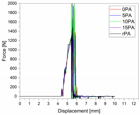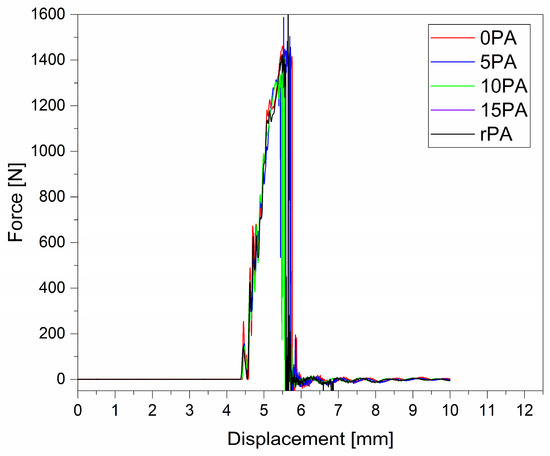 The impact strength of polymeric materials is important due to the area of their application. Polyamide reinforced with glass fiber is characterized by high rigidity and dimensional stability, which allows it to be used in the production of responsible structural elements. Moisture or water can affect the mechanical, physicochemical properties, and dimensional stability of polyamide products [25]. Polyamide, in its structure, has polar amide groups that can form hydrogen bonds with water molecules; therefore, conditioning products in water after production significantly impact their properties [26]. The presence of water between the polymer chains increases the mobility of the chain, causing the effect of polyamide plasticization [27]. Therefore, stiffness and hardness after conditioning are reduced [28]. Samples conditioned in water were characterized by higher impact strength than unconditioned samples (Table 2). The average value of impact strength for conditioned samples with regranulate and virgin samples was 66 kJ/m2, while for not conditioned, 62 kJ/m2. Figure 9 and Figure 10 show the characteristic curves of maximum force versus displacement recorded during the unnotched Charpy impact test for the verified materials. All tested polyamide samples were broken with a hammer blow in accordance with the given measurement parameters. For the tested materials, a significant increase in the maximum force that was needed to destroy the samples subjected to conditioning can be observed. The occurrence of damage in a thermoplastic material containing short fibers is most often caused by two factors: fiber matrix deboning and microcracks in the matrix [29,30].
