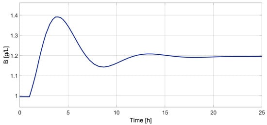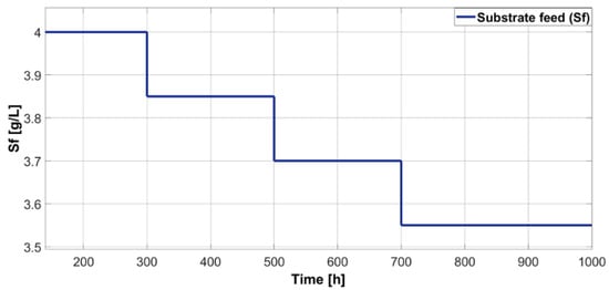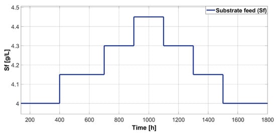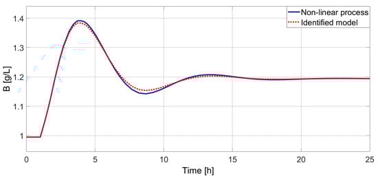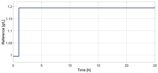 The identification method of the chemical process starts with an input setting that has an initial amplitude of 0.995 [g/L] and then, after 1 [h], grows to 1.194 [g/L] as shown in