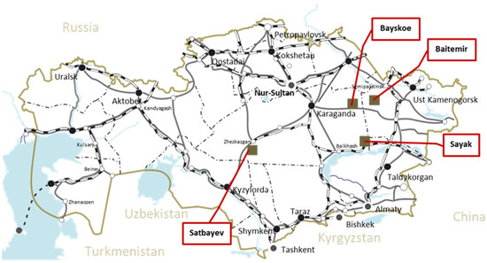 The data obtained during the corresponding experiments conducted at the Institute of Metallurgy and Ore Beneficiation JSC were reviewed here and analyzed to identify and describe the regularities of increases in the sulfuric acid consumption level during the copper leaching process. This article includes the results of copper leaching experiments in the full hydrometallurgical cycle of four copper dumps from different deposits located in Central Kazakhstan (Figure 1). Thus, data on the initial composition of ore material and sulfuric acid leaching results were obtained from the study projects of the following deposits, conducted during the indicated period: 2014–2016, the Bayskoye deposit; 2015, the Baitemir deposit; 2016–2018, the Sayak deposit; and 2021–2023, Satbayev town copper dumps, including bioleaching experiments. The chemical and phase compositions of ore material were analyzed, the optimum conditions for the leaching process were selected, the copper extraction efficiency was assessed, and the sulfuric acid consumption was recalculated per ton of ore and based on the quantity of copper extracted from the solution that was determined when all the specified projects had been performed [16,17].