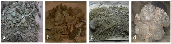 Appearance of samples taken from copper ore deposits of (a) Bayskoye; (b) Baitemir; (c) Sayak; and (d) Satbayev town dump.