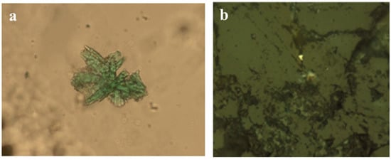 Images of mineralogical analysis of the main copper minerals: (a) cluster of prismatic malachite crystals (0.5 mm × 0.3 mm); (b) chalcopyrite in veinlets of nonmetallic mass (0.04 mm × 0.02 mm).