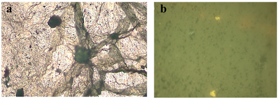 Mineralogical analysis showed that copper in the studied ore samples was mainly in the oxidized forms of malachite, as well as in the form of chalcopyrite phenocrysts (Figure 3).