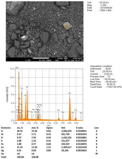 A detailed study of residual copper phenocrysts was performed with the use of a JXA-8230 electron probe microanalyzer manufactured by JEOL. This provided the corresponding spectra for oxygen, silicon, and aluminum, which are characteristic of aluminosilicates, and evidence of their presence in these particles (Figure 7).
