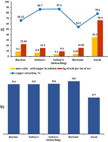The sulfuric acid consumption level per ton of ore depended largely on the initial content of copper and its extraction efficiency in the solution. According to the calculation of acid consumption in the leaching process based on the recalculation per ton of ore, the lowest values were found for the Satbayev deposit samples; 15.5 kg per ton of ore, and 9.4 kg per ton of ore in the case of bacterial oxidation. The consumption of acid per ton of ore was 15.83 kg in experiments with Baitemir ore, and 22.69 kg with Bayskoye ore. The highest consumption in this ratio was found in the leaching of the Sayak sample, which was 66.4 kg of acid per ton of ore.