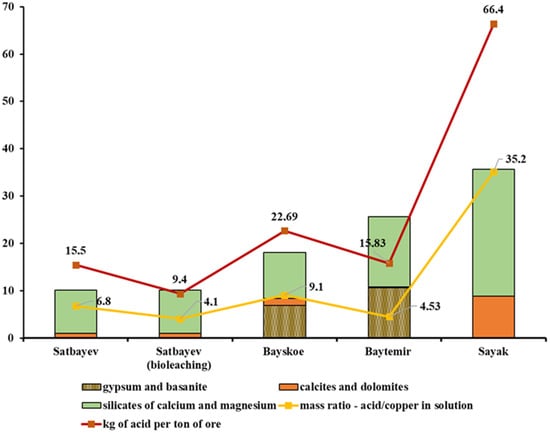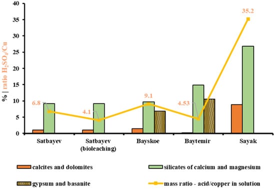 In conclusion, the dependence of the sulfuric acid consumption rate on the amount and forms of alkaline earth metal mineral content was established following a comparison of results obtained during sulfuric acid leaching experiments conducted from 2014 to 2023 at four different copper deposits. In addition to the known fact about the ability of alkaline earth metal carbonate minerals to neutralize an acidic environment, some calcium and magnesium silicates were also found to increase sulfuric acid consumption in the leaching process. Minimum levels of sulfuric acid consumption were noted during the leaching process for samples from Satbayev and Baitemir deposits, and maximum consumption levels were found in experiments with Sayak ore (H2SO4/Cu = 35.2:1).