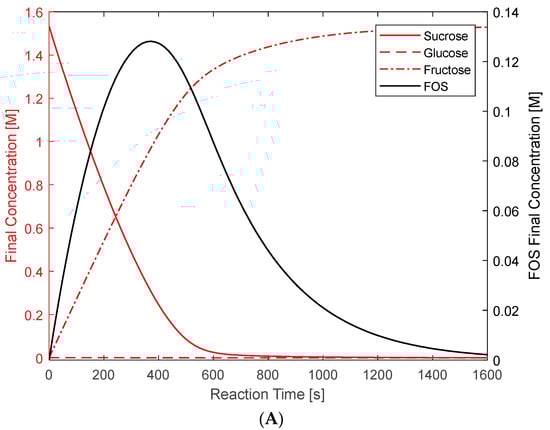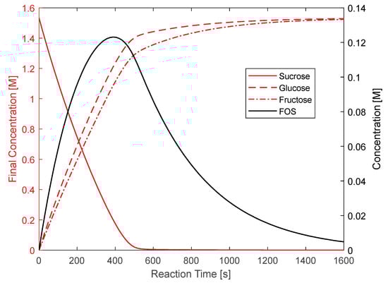 Figure 2 illustrates the obtained profiles that align with the simulation results reported by Khandekar et al., whose original model was adapted to include the calculated Michaelis–Menten kinetic parameters for the sucrose hydrolysis reaction []. Khandekar et al.’s research demonstrates an excellent correlation between the experimental and simulated results (obtained by COPASI simulation) []. Consequently, the latter’s resemblance to the profiles shown in Figure 2 suggests that the modified kinetic model proposed in this study maintains an excellent fit for the experimental behavior. A similar trend has been observed in other modeling works on the production of resveratrol, cephalosporin C, and inulinase [,,]. As anticipated, almost all sucrose is consumed because it is either hydrolyzed, yielding fructose and glucose, or consumed in the transfructosylation reaction. Since fructose is also consumed in the transfructosylation reaction, its production rate is typically lower than that of glucose. In addition, the production of FOS follows a convex curve over time. The latter indicates that the maximum production of FOS occurs after approximately 6.6 min of a continuous reaction. However, FOSs are later consumed to produce fructose and sucrose, which are eventually hydrolyzed. After both reactions have consumed sufficient sucrose, the system tends to favor hydrolysis over transfructosylation and even consumes FOS to regenerate sucrose and continue its hydrolysis. This behavior is well documented [].