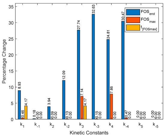 To gain a deeper understanding of the model’s behavior, a sensitivity analysis was conducted to determine the impact of each kinetic constant on the final concentration of FOS (FOSend after 1600 s), the maximum concentration of FOS (FOSmax), and the time at which the maximum concentration of FOS occurs (tFOSmax). The equations were individually solved after increasing each constant by one order of magnitude. Figure 3 shows the results for all three variables when modifying each constant. Sensitivity analyses have been employed in other works to understand the impact of kinetic constants [,].