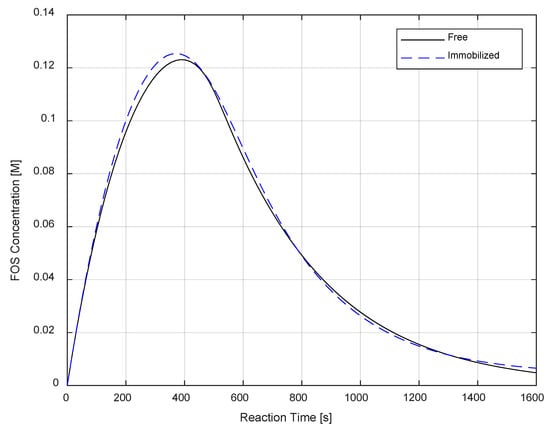 The kinetic constant with the greatest variation (k−1) counteracted the change in the hydrolysis-related Michaelis–Menten parameters between the free and immobilized enzymes, satisfying the known kinetic restriction specified alongside the estimation method. In addition, the glucose inhibition reaction (Equation (5)), whose parameters are associated with the minimum impact on FOS profile properties, became irrelevant as its associated forward kinetic parameter became null. Figure 4 depicts the profiles of both the free and immobilized FOS concentrations, demonstrating that the estimated immobilized kinetic parameters in the batch reaction model provide a satisfactory fit. The estimation of immobilized kinetic parameters has been reported to be crucial in other studies involving immobilized enzymes, such as urease, β-galactosidase, and glucose oxidase [,,].