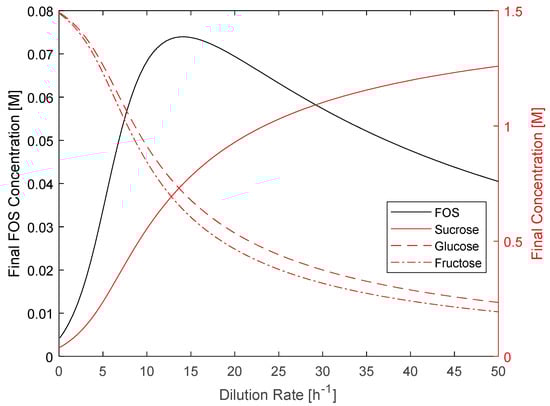 In Equation (19), Ci and C0,i represent the final and inlet concentrations of species i, respectively. For each species i, the reaction rate ri is described by the right-hand side expression of the corresponding batch modeling differential equation (Equation (6) to Equation (13)). The resulting exiting concentrations yielded a profile for each of the sugars involved in the reactive system as a function of the dilution rate, enabling us to determine the optimal dilution rate for CSTR operation and the corresponding maximum exiting FOS concentration. We specified the initial concentrations of sucrose and invertase as 1.53 M (525 g/L is the optimal value reported by Khandekar et al. []) and 2.78 × 10−4 M, respectively. We assumed the absence of all other species in the reactor’s feed stream.