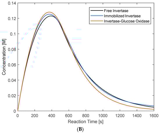 To accurately model the change in the kinetics of a system caused by enzyme immobilization, information on the enzyme’s performance before and after immobilization was required. Khandekar et al.’s model does not assess immobilization, so Michaelis–Menten constant pairs describing the enzyme’s performance on sucrose hydrolysis under both free and immobilized conditions had to be obtained from published studies and incorporated into the model []. Valerio et al. reported these constant pairs for free and immobilized SInv: KM = 0.0657 M and Vmax = 0.0278 M∙s−1, and KM = 0.2057 M and Vmax = 0.0305 M∙s−1, respectively []. SInv was immobilized on chitosan nanoparticles prepared using the ionotropic method and activated with glutaraldehyde []. These constants were chosen for two primary reasons: first, their magnitudes are consistent with those reported in other enzyme immobilization studies [,]; second, the covalent binding of enzymes on a glutaraldehyde-activated chitosan nanoparticle surface is significantly similar to the proposed method of coating magnetic nanoparticles in the current investigation.