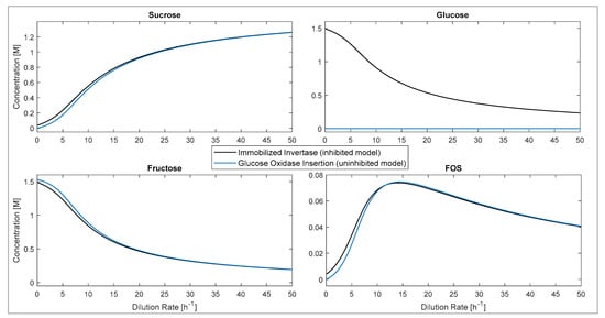 The sucrose, fructose, glucose, and FOS exiting concentrations as a function of the dilution rate are shown in Figure 5, with the optimal dilution rate at 14.2 h−1 (τ = 4.22 min) and the maximum FOS concentration corresponding to 0.074 M. Other modeling works on gluconic acid and chitooligosaccharide production, and pectate digestion using immobilized enzymes in CSTR systems have reported similar concentration profiles [,,].