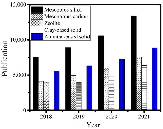 Inorganic synthetic and natural solids such as metal oxide, mixed noble metal oxide composites, zeolite, clay, carbon, silica, silica alumina, and their modified forms have been reported. Among these materials, mesoporous silica-based catalysts demonstrated a superiority for biodiesel production. Based on the progress of published papers, an increasing amount of research on mesoporous silica-based catalyst is demonstrated, as can be seen from the comparison presented in Figure 1.