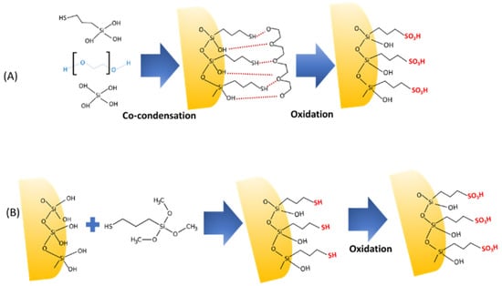 Scheme of sulfonic acid tethering onto mesoporous silica through (A) co-condensation and (B) post-synthesis methods.