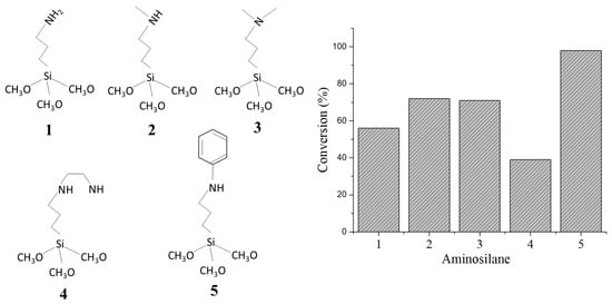 The surface basicity modification of mesoporous silica is usually performed by anchoring alkylamine and other nitrogen ligands, and the immobilization of alkali/alkali earth oxide such as CaO, MgO, and Li2O [,,,]. The modification of mesoporous silica with 3-aminopropyltriethoxysilane (RNH2), 2,3-aminoethylamino)propyltrimethoxysilane (NN), and 3-diethylaminopropyltrimethoxysilane (DN) showed increased basicity, which related to the increasing turn-over number. The compared kinds of amines confirmed the superior performance of the tertiary amine []. The presence of tertiary amines can also facilitate an increase in nucleophilicity due to the presence of three alkyl groups, making the catalyst more reactive and able to form more robust interactions with the reactants during the transesterification process. This process causes faster kinetics and increases efficiency compared to secondary and primary amines.