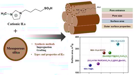 Mesoporous material-supported ILs have been widely studied, especially in the conversion and production of biodiesel. These materials provide many advantages, such as dissolving various organic compounds and good stability at high temperatures and pressures. SBA-15 is a mesoporous silica-based material widely developed as a catalyst because it has uniform hexagonal pores with an average diameter of around 15 nm. Besides being cheap, this material also has a narrow pore size distribution and a variety of chemical functional groups, making it easy to modify to increase efficiency. Yuan et al. (2012) reported the heterogenous catalyst-based basic IL-supported mesoporous SBA-15 for the epoxidation of olefins []. The basic ILs, 1-methyl-3-(chloropropyltriethoxysilane) imidazolium chloride (CIL), were attached to the surface of SBA-15 through the surface grafting reaction method. They found that the CIL could be loaded onto mesoporous SBA-15 until 0.39 mmol/g. The CIL-supported SBA-15 showed good catalytic activity for the epoxidation of various olefins compounds, with the highest conversion and epoxide yields until 94% for the cyclooctene compound. This type of catalyst is quite reactive for epoxidation reactions on cyclic olefins and less reactive for open and linear chain olefins. A related study was also reported by Karimi and Vafaeezadeh (2012); they investigated acidic IL-supported SBA-15 for solvent-free esterification []. Differences in the structure and functionalization of the IL groups assigned to the mesoporous material SBA-15 have been shown to affect the catalyst’s phase and mass transfer properties. Acidic hydrophobic [OMIm] [HSO4] is believed to have efficient mass transfer properties for esterification processes, especially in biodiesel production. Furthermore, this type of IL can also have increased Brønsted acid strength and high reusability because it does not interact with the water produced from the primary reaction process. Figure 5 shows an example of a modified cationic ionic liquid process on mesoporous silica. When cationic ionic liquids are introduced or immobilized onto the surface of mesoporous silica, they can change the properties and functionality of silica materials. The immobilization of cationic ionic liquids onto the surface of silica can increase its catalytic activity, selectivity, stability, and several surface characteristics, as shown in Figure 5. Different types of ILs modified on mesoporous silica can produce various surface areas. Thus, selecting the kind of IL directly affects the characteristics of the resulting mesoporous silica. In addition, the type of modification method used also affects it directly. Various synthesis methods have been studied, but grafting and impregnation are the primary methods for supporting ILs in mesoporous silica materials [,]. Both are general methods that are representative of chemical and physical processes. Impregnation is a method based on physical interaction and is more straightforward; namely, it involves the adsorption of ILs on the surface of mesoporous silica. In contrast, the grafting method uses chemical interactions between ILs and the surface of mesoporous materials. As a result, the grafting method shows better stability but has drawbacks such as complicated and complex preparation methods, requiring a long time, and high costs. These differences in synthesis methods directly affect the morphological properties of the catalyst, such as pore size and surface area. In its application as a catalyst in the production of biodiesel through a variety of different reactions, the specific surface area of the IL-supported mesoporous silica determines the percentage of product produced. However, the pore diameter and the reaction time applied during the process also influence the ratio of products [].