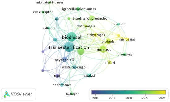 Based on the mapping and bibliometric analysis results, as shown in Figure 6, converting waste biomass into biodiesel and bioethanol is still an exciting topic and supports the renewable energy transition policy. The development of alternative synthesis methods that are more environmentally friendly is still a topic that is continuously being studied to reduce the environmental impact of high energy consumption. Servicing raw materials and their availability is an essential factor in developing a sustainable and abundant system for future biodiesel and bioethanol production. Currently, fast pyrolysis involving enzymatic reactions and microorganisms as the main raw material is considered to have the potential to be developed for the production of bioenergy [].
