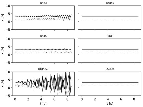 It is obvious from the first column of Figure 2 that the methods RK23, RK45 and DOP853 do not converge. In contrast, the methods Radau, BDF and LSODA result in converging solutions (Figure 2, second column). RK23, RK45 and DOP853 have in common that they are explicit Runge–Kutta methods. The converging methods Radau, BDF and LSODA are working with implicit Runge–Kutta methods or implicit multi-step methods. For further simulations, the method BDF was used.