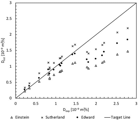 Misek [] and Berger [] published experimental datasets for diffusion coefficients, which are limited to specific systems of components, limited concentration ranges and three temperatures. These data sets were measured in a diffusion cell using the diaphragm method after Stokes. For estimation of diffusion coefficients, the described methods of Einstein, Sutherland and Edward were used. To have comparable experimental and estimated datasets, the values were estimated using the same temperatures and systems of components used by Misek and Berger for comparison (Figure 3).