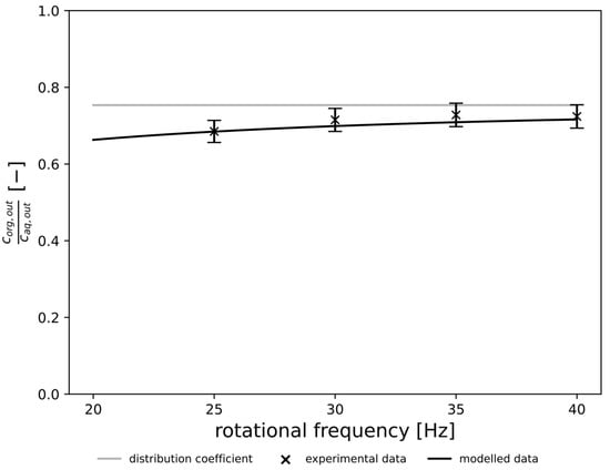 The steady state of the ACC was reached after 5 min. Thus, sampling was done 5 min after start-up of the ACC for all experiments. For validation purposes experimental data were collected and compared to simulated data. Geometrical parameters were predefined by the type of ACC used in the experiments and obtained directly by measuring the dimensions of the components. A range of rotational frequencies, temperatures, flow rates, flow rate ratios and different systems of components were tested and simulated. Experimental and simulated data of the output concentration ratio for rotational frequencies of 20–40 Hz are shown in Figure 4. Additionally, the distribution coefficient is shown as a grey line. The remaining operating conditions were kept constant at a temperature of 20 °C, a flow rate of 150 mL/min and a flow rate ratio of 1. The used system of components was water–acetone–toluene. Experimental data show very good agreement with simulated data over the whole range of rotational frequencies.