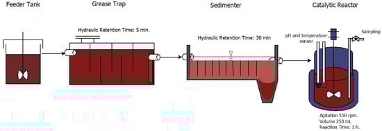 The wastewater was passed through a grease trap for 5 min and then sedimented for 30 min in the pilot plant of the UFPS Operations Laboratory. A catalytic reactor of 600 mL and an operating volume of 250 mL was used, with temperature and pH control (Figure 1). Stirring was performed at 550 rpm. HCl (hydrochloric acid) and NaOH (sodium hydroxide) at a concentration of 0.1 mol/L were used for pH control. The H2O2 concentration was 35%, from which the concentrations used in the experimental design were calculated. Finally, 90% commercial purity grade sodium bicarbonate was used to determine the design concentrations.