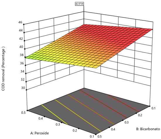 Figure 2 shows the response surface for COD, where a lower concentration of bicarbonate and peroxide enhances COD removal.
