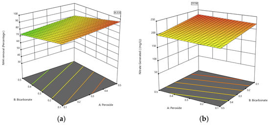 Figure 4a shows that the response surface analysis between bicarbonate concentration and H2O2 dosage had a statistically significant effect on the COD removal rate at the central level of initial pH and temperature. As shown in Figure 4a, the COD removal rate was favored by bicarbonate and peroxide concentration up to the central level and then decreased rapidly with ozone concentration. Therefore, the COD removal rate was affected from the concentration of 0.06 mol/L to 0.3 mol/L, where the COD removal rate was favored. For the case of peroxide in this study, it was found that values above 0.23 mol/L affect the COD degradation process, decreasing the removal rate; studies of AOPs using H2O2 have indicated the importance of determining the optimal dosage of peroxide since high dosages can affect the process and increase the concentration of COD in the wastewater [], as could be evidenced in this study. On the other hand, Figure 4b shows that the response surface analysis between the bicarbonate concentration and the H2O2 dose had a statistically significant effect on the rate of oxidation of ammonium to nitrate at the central level of initial pH and temperature. The oxidation rate was favored by both the bicarbonate and peroxide concentration; dosages between 0.01 mol/L and 0.4 mol/L in the case of bicarbonate facilitated the oxidation process of ammonium to nitrate, as did peroxide dosages between 0.05 mol/L and 0.23 mol/L. To the best of the authors’ knowledge, there is no evidence in the literature regarding the influence of bicarbonate concentration on ammonium removal. However, Ref. [] reported that the removal of ammonium through the ozonation process could be affected by high concentrations of bicarbonate since it can make the medium too alkaline and therefore interferes with the generation of nitrates, hence the importance of determining the optimal dose. Regarding the influence of H2O2 on the removal of ammonium, it has been reported that the oxidation of ammonium to nitrate occurs due to the release of oxygen radicals and the degradation of azo dyes present in these types of effluents, such as tannery effluents, which leads to the search for ways to optimize dosages that do not exceed the optimum and interfere with the oxidation rate [].