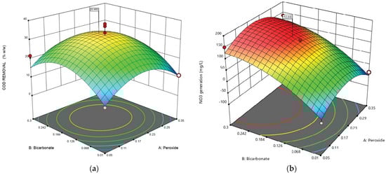 According to the previous design, the concentration of both peroxide and bicarbonate significantly affects both the removal of COD and the generation of NO3; therefore, in order to improve both responses, a Central Composite Design was employed (2 factors, 3 levels, and 13 experiments). Table 6 shows the levels of both factors. For each experiment, pH was kept constant at 5.1, the temperature was maintained at 57.5 °C, and the mixing of the samples was performed at 550 rpm.