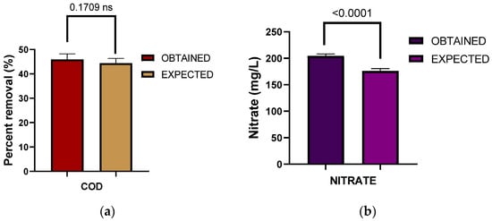 Validation results between the expected value resulting from the experimental design and the experimentally determined value for the percentage of COD removal (a) and nitrate formation (b).