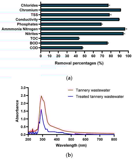 The tanning industry generates highly polluting waste, especially in its effluents. The operational processes of this industry require large amounts of water; it has been reported that an average of 10–25 m3 of water is consumed in the various stages of the process, and an average of 8 to 20 m3 of wastewater may be generated; this amount may vary depending on the technological development of each industry []. These effluents are characterized by high levels of pollutants from organic matter such as meat particles, hair, blood, soluble proteins, and fertilizer; in addition, there is the inorganic load of dyes, chromium salts as tanning agents, sulfur and lime salts, and other recalcitrant compounds []. These effluents also contain heavy metals such as lead (Pb2+), cadmium (Cd2+), chromium (Cr6+), zinc (Zn2+), copper (Cu2+), and iron (Fe3+) [], as well as solvent–bone pollutants [] that alter the natural characteristics of the ecosystems into which these effluents are discharged if they are not treated beforehand, and which can have harmful effects on those who consume them; liver and kidney damage, skin irritation, chronic bronchitis, nasal irritation, cancer, and DNA (deoxyribonucleic acid) abnormalities leading to mutations and malformations, as well as other complications in the digestive system, are possible harmful effects [,]. It is estimated that the waste generated by this industry in the form of water accounts for just over 300 million tons of toxic wastewater and approximately 64,320 tons of sludge [], making the treatment of wastewater from the leather industry a challenge.