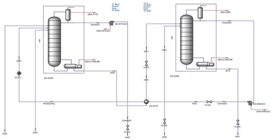 Debutanizer: This distillation column, equipped with 34 valve trays, separates C4 compounds (the top product) from C5 compounds and heavier substances (the bottom product). It operates at a pressure of 4.34 kg/cm2, with top side and bottom side temperatures of 47 °C and 116 °C, respectively.