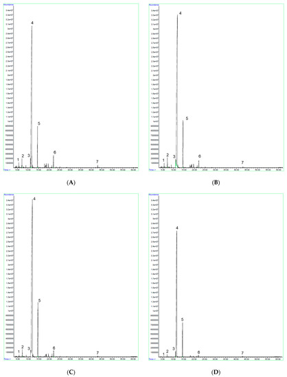 GC/MS chromatograms of Corymbia citriodora essential oil, obtained by reduced pressure extraction at 690 Torr (A), 540 Torr (B), 390 Torr (C), and 240 Torr (D). 1—β-pinene; 2—eucalyptol (1,8-cineole); 3—isopulegol; 4—citronellal; 5—citronellol; 6—PMD (p-Menthane-3,8-diol), 7—(E)-caryophyllene.